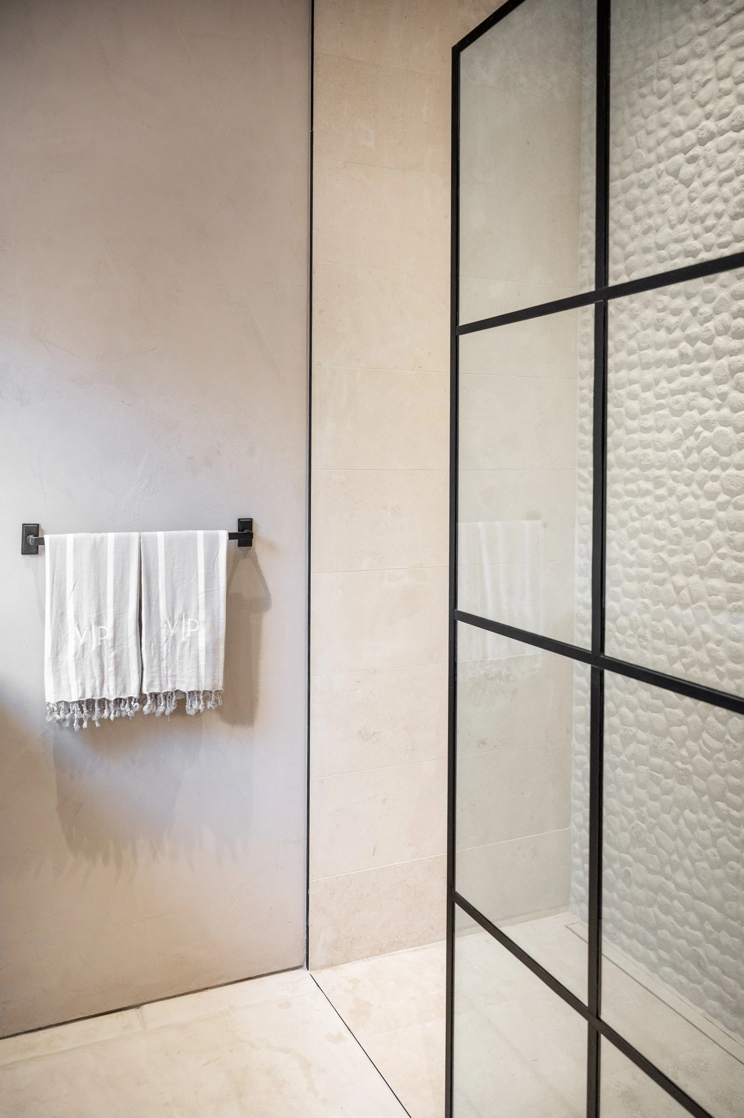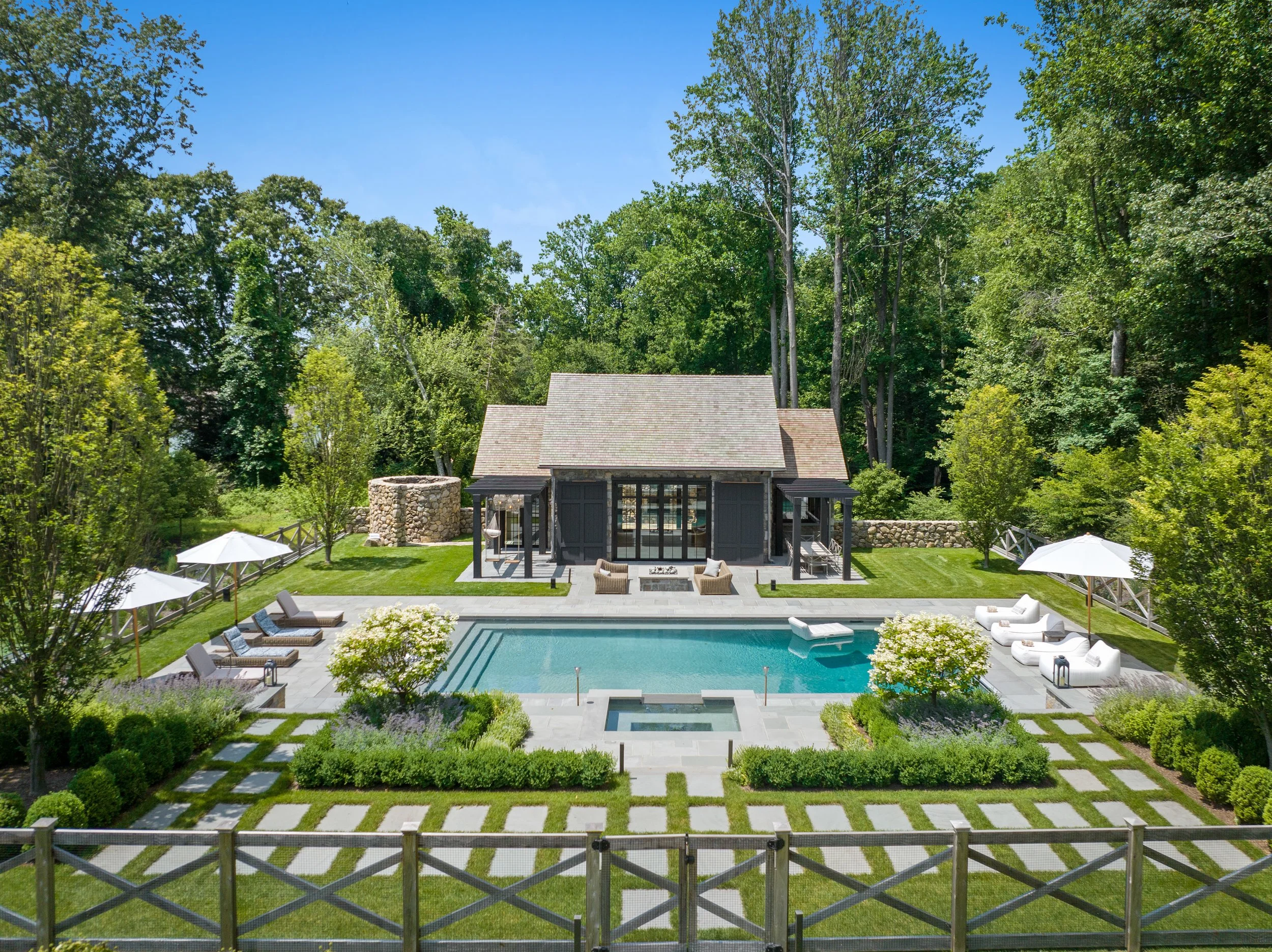 This new pool house is thoughtfully designed to nestle into a lush backyard garden. We partnered with Stecks Nursery and the clients to craft their personal sanctuary. We also worked with a local timber frame company using reclaimed beams to create beautiful exposed scissor trusses. Features like the private garden with fireplace and spiraled outdoor shower make it a unique oasis. Spacious and light-filled interiors with plaster walls, limestone floors, and an inspired design leave a lasting impression.